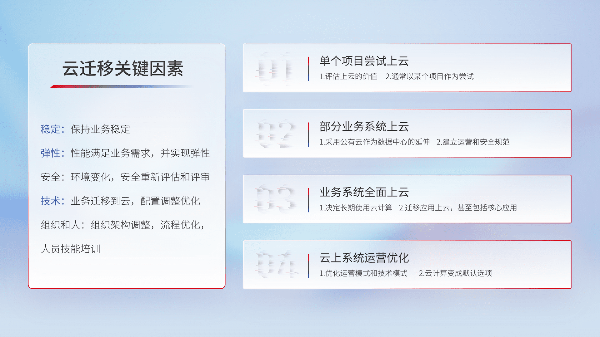 结合实际业务,,,从规划设计、、云平台选型、、云原生改造、、、、数据迁移、、、集成交付,,,迁移全过程为客户识别最佳上云路径,,做好风险识别管理,,,设计网络架构、、、、身份权限、、安全审计合规、、、操作审计、、、、日志审计、、、、监控告警策略、、、、多站点容灾设计等,,,,对云上基础设施进行整体规划,,,,提升IT治理水平,,以满足弹性、、、高可用、、、、高性能的需求。。。